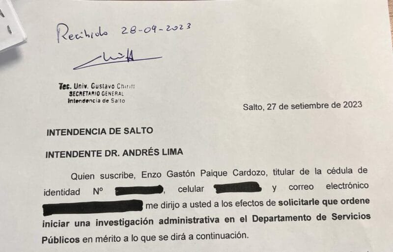El colorado solicitó formalmente a la Intendencia de Salto que inicie una investigación administrativa, donde deberán constatar el destino de una gran cantidad de madera de origen pública. Paique manifestó que “cualquier empresa serie debería llevar el registro, más, tratándose del gobierno departamental, de la madera que sale o ingresar, así como de las cantidades y sus usos”. A su vez aportó elementos que le llegaron en los últimos días, a raíz de manifestaciones a la prensa, donde tanto funcionarios de carrera como vecinos de la ciudad, habrían denunciado manejos irregulares de los recursos con los que cuenta el Departamento de Servicios Públicos de la Intendencia de Salto.
