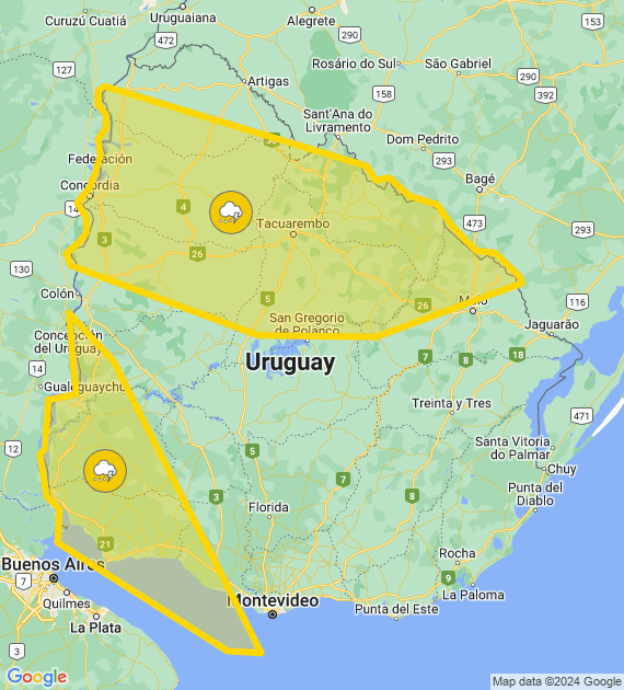 Descripción: Frente frío ingresa por el suroeste del país, generando tormentas algunas puntualmente fuertes. Cabe destacar que en zonas de tormentas se podrán registrar lluvias abundantes en cortos períodos, ocasional caída de granizo, intensa actividad eléctrica y rachas de vientos fuertes. Se continuará monitoreando la situación y se informará ante eventuales cambios.