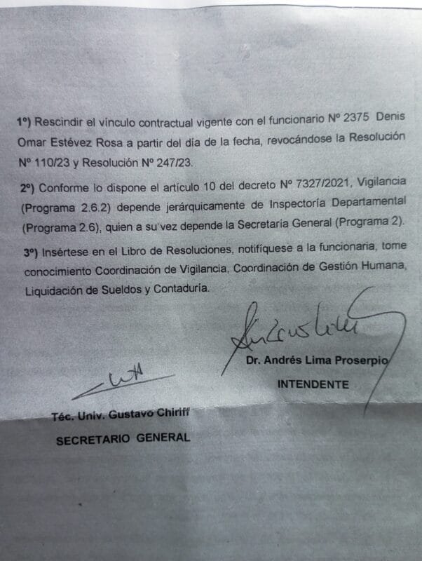 En el día de ayer 12 de marzo el intendente de Salto cesó a su Coordinador de Vigilancia grado 12,Denis Estévez . Hijo del Diputado Omar Estévez del Partido Colorado, que lo había sumado en junio del 2023. Los motivos aún no son públicos pero obviamente tienen que ver con el imperio Lima que se desvanece ,se resquebraja