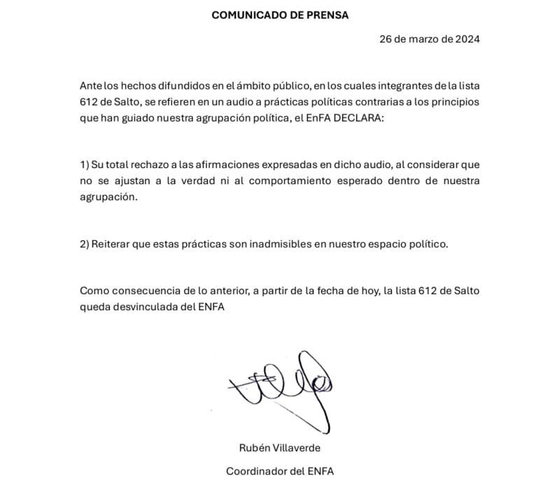 Una vez más Quinto Elemento lo hizo, denunció , informó como corresponde,ante el silencio cómplice de muchos operadores periodísticos , que se rasgaron las vestiduras con otros temas y en este, «falta envído».El EnFa (Lima), Villaverde, Albarenque y demás ,enviaron un comunicado donde expulsan de su estructura a la lista 612 , lista cuya referente principal es la sra Karina Correa , quien envió el audio a la cooperativa exigiendo militancia y denunciando presiones de Lima.