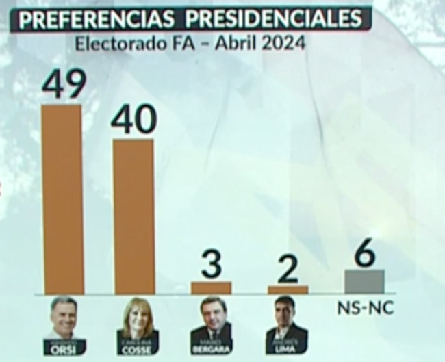 Sin embargo, al ser consultados quienes expresaron que seguro votarían en la elección interna, ahí los porcentajes de preferencias tuvieron una leve variación: Orsi recogió el 47%; Cosse, el 44%; Bergara, el 4%; y Lima, 1%.