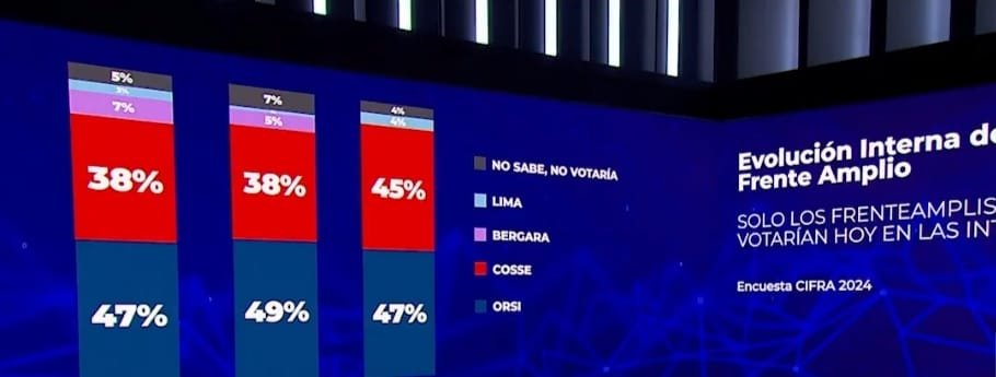En la interna del Frente Amplio quedan tres candidatos en competencia. Entre quienes hoy votarían al Frente Amplio, 46% prefiere a Yamandú Orsi, 41% a Carolina Cosse y 6% a Andrés Lima. La diferencia entre Orsi y Cosse es hoy de cinco puntos. Si se miran las preferencias del 58% de los frenteamplistas que dicen que seguramente concurrirán a votar el domingo 30 de junio, la diferencia entre Orsi y Cosse se achica a apenas dos puntos: 47% a 45%.Finalmente la interna del Partido Colorado “no permite obtener datos mínimamente confiables, porque son pocos los encuestados que piensan votar al partido, y el margen de error de sus respuestas es, por tanto, muy alto. Con esta salvedad, los líderes más mencionados hoy son [Andrés] Ojeda, [Gabriel] Gurméndez y [Robert] Silva, en ese orden”, según el informe.