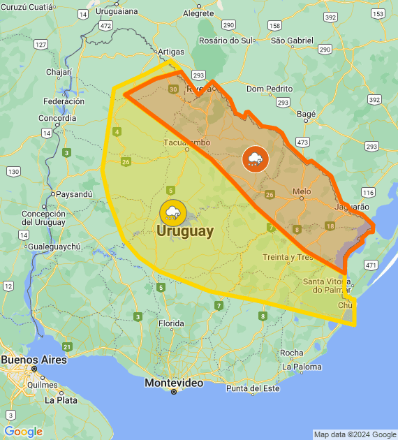Descripción: Frente semi-estacionario afecta el país, generando tormentas algunas puntualmente fuertes. Cabe destacar que en zonas de tormentas se podrán registrar lluvias abundantes en cortos períodos, ocasional caída de granizo, intensa actividad eléctrica y rachas de vientos fuertes. Se continuará monitoreando la situación y se informará ante eventuales cambios.