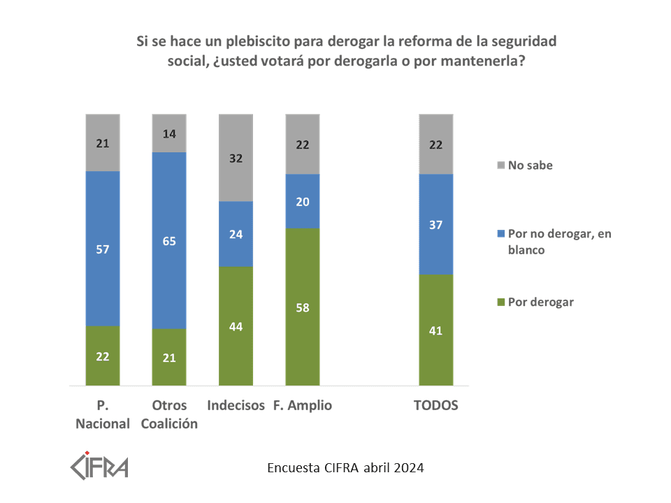 Respecto al plebiscito sobre la reforma jubilatoria, el 41% está a favor de derogar la reforma y el 37% en contra. El 22% restante no tiene opinión sobre el tema. La mayoría absoluta de los votantes de quienes piensan votar al Frente Amplio está a favor de derogar, y la mayoría absoluta de los votantes de la Coalición está en contra del plebiscito. Entre los que no han decidido a cuál partido votar, el 44% está a favor de derogar la reforma y el 24% está en cont