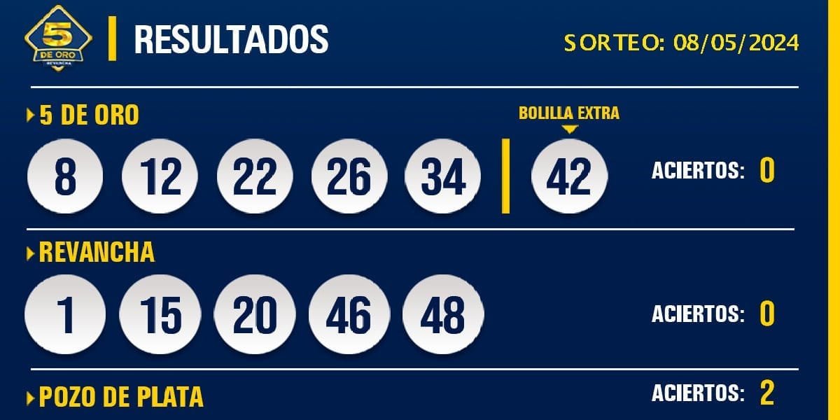 Les compartimos los resultados del sorteo del 5 de Oro con Revancha del día 8 de mayo de 2024.