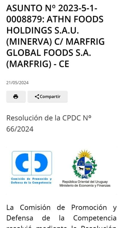Comisión de Promoción y Defensa de la Competencia resolvió mediante la Resolución N.º 66/024, denegar la solicitud de autorización de concentración económica tramitada en el asunto indicado, considerando que, como resultado de la evaluación y valoración de los factores que han sido incorporados en el análisis, tanto por las partes interesadas como por la propia Administración y los terceros consultados, se cuenta con elementos probatorios suficientes para concluir que la operación de concentración proyectada, encuadra en los supuestos prohibitivos previstos en el artículo 9º de la ley 18.159 y sus modificativas, y por ende ser denegada de conformidad con lo previsto en el literal C) de su inciso segundo.