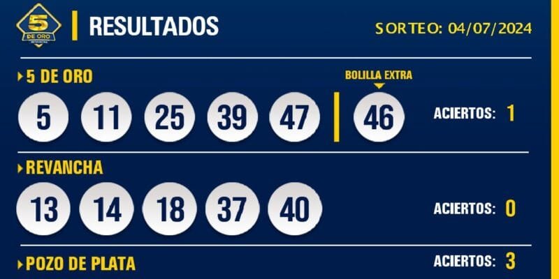 Les compartimos los resultados del sorteo del 5 de Oro con Revancha del día 4 de julio de 2024.