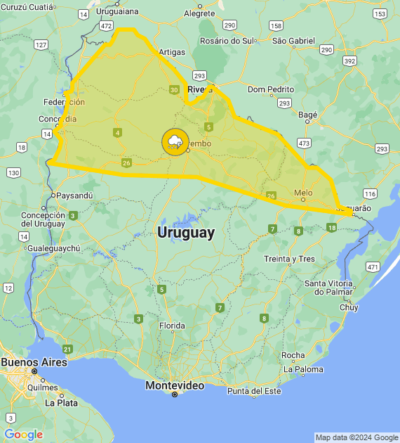Descripción: Perturbación atmosférica asociada a masa de aire húmeda e inestable afecta el país, generando tormentas algunas puntualmente fuertes. Cabe destacar que en zonas de tormentas se podrán registrar lluvias abundantes en cortos períodos, ocasional caída de granizo, intensa actividad eléctrica y rachas de vientos fuertes. Se continuará monitoreando la situación y se informará ante eventuales cambios.
