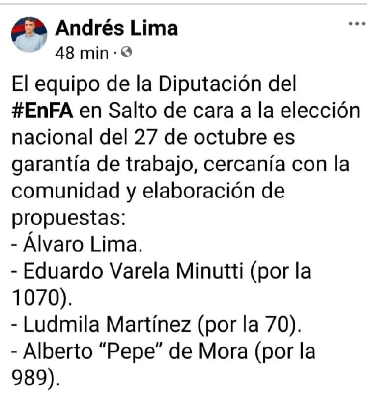 Lima la baja y en su lugar va la integrante de la lista de Furtado , Luzmila Martínez , quien sería hija de Mario Martínez dirigente de Adeoms. Una interna complicada en el Enfa,con dirigentes que no avalan al principal dirigente de la lista 70 , y ahora con esta nueva movida , que habla a las claras de incertidumbre y de improvisación. Situaciones que se dan también de cara al Senado ,nadie quiere a Lima , bueno….capaz alguien aparece por ahí , pero está difícil ..