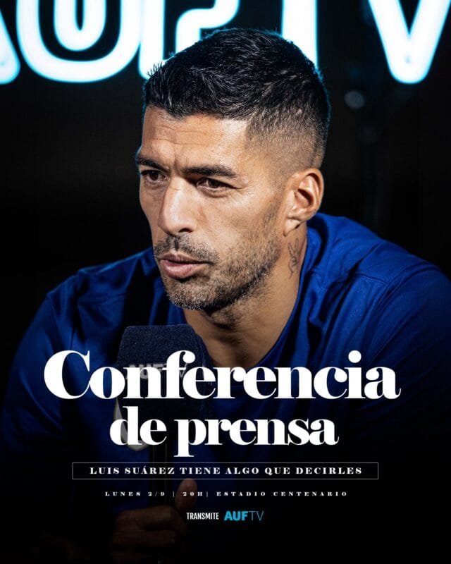 El máximo goleador de la historia dará una conferencia de prensa el lunes desde el Estadio Centenario», anunció la AUF a través de la cuenta oficial de la Selección Uruguaya.El futbolista de la Selección Uruguaya de Fútbol, Luis Suárez, brindará una conferencia de prensa este lunes a la hora 20:00 en el Estadio Centenario.