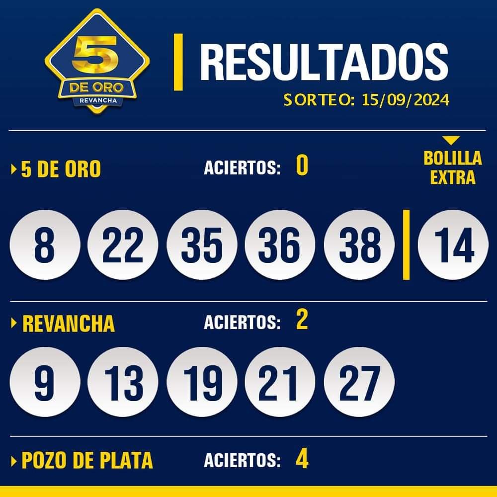 Les compartimos los resultados del sorteo del 5 de Oro con Revancha del día 15 de setiembre de 2024.