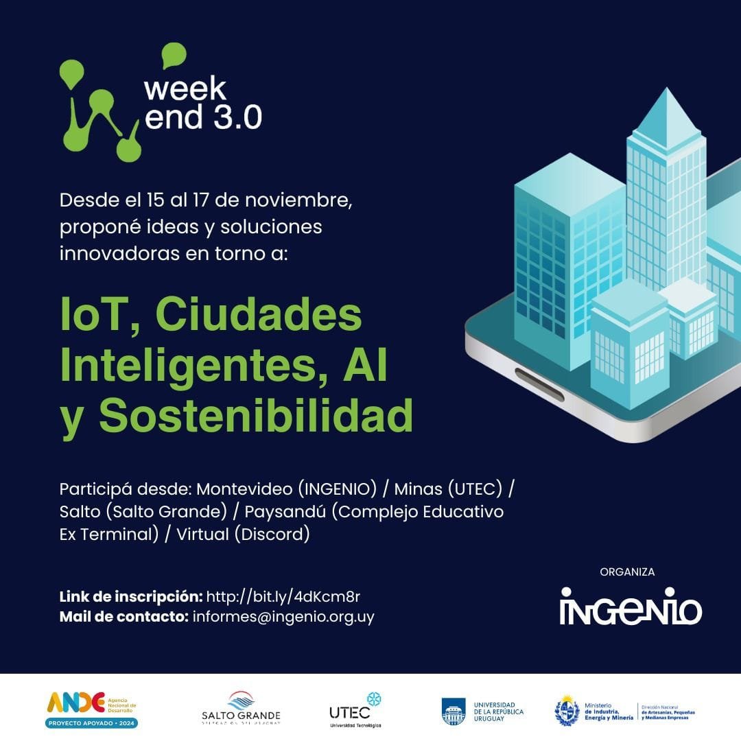 💡 Weekend 3.0 es la oportunidad perfecta para desarrollar proyectos enfocados en #Sostenibilidad, #AI, #IoT y #CiudadesInteligentes. Este evento, organizado por Ingenio Incubadora de Empresas, con el apoyo de ANDE, UTEC, UDELAR, Salto Grande y MIEM, tiene como objetivo promover la innovación colaborativa en un entorno lleno de inspiración y aprendizaje.