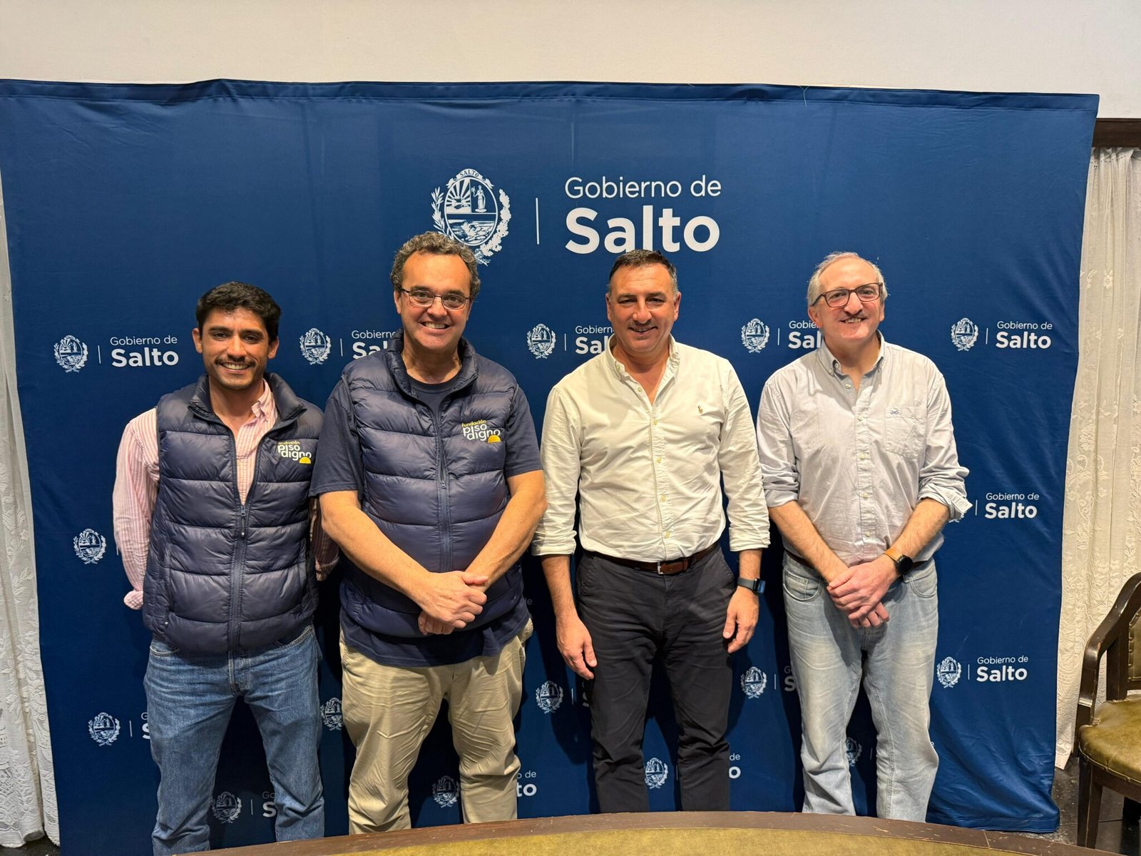 El intendente de Salto, Dr. Carlos Albisu, acompañado por el Esc. Juan Andrés Machiavello, se reunió con representantes de la Fundación «Piso Digno», encabezados por su director, Pablo Bartol, exministro de Desarrollo Social, y el coordinador general, Matías Acosta.