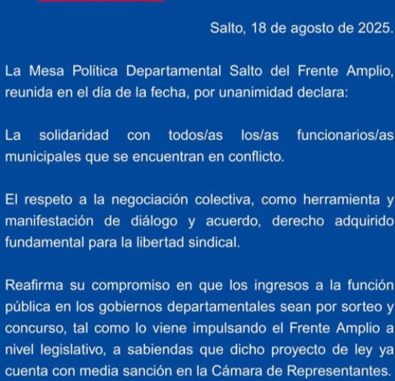 La Mesa Departamental del Frente Amplio Salto se aleja del conflicto de Adeoms Salto, en un comunicado del día 18 de agosto. En el mismo , hacen llegar la solidaridad a los funcionarios involucrados en el conflicto y «el respeto a la negociación colectiva y al diálogo y acuerdos para la libertad sindical», en lo que parece ser una evaluación fría y lejana de la situacion de la directiva de ADEOMS y las licencias sindicales. Pero lo más importante es el final de este comunicado dónde , el Frente Amplio afirma como única forma de ingreso a la administración pública , por concurso o sorteo.En clara contraposición histórica e ideológica de un Frente Amplio Salto que ha tratado de perpetuar el mecanismo de la dirección directa, diez años de Frente Amplio Salto en la intendencia, que ha dejado más de seiscientas designaciones. Clarita la cuenta, más allá de los 292 , que son los últimos. La hipocresía, el lavado de manos como Poncho y el tratar de despegarse del limismo y de Cholin , sin duda alguna.