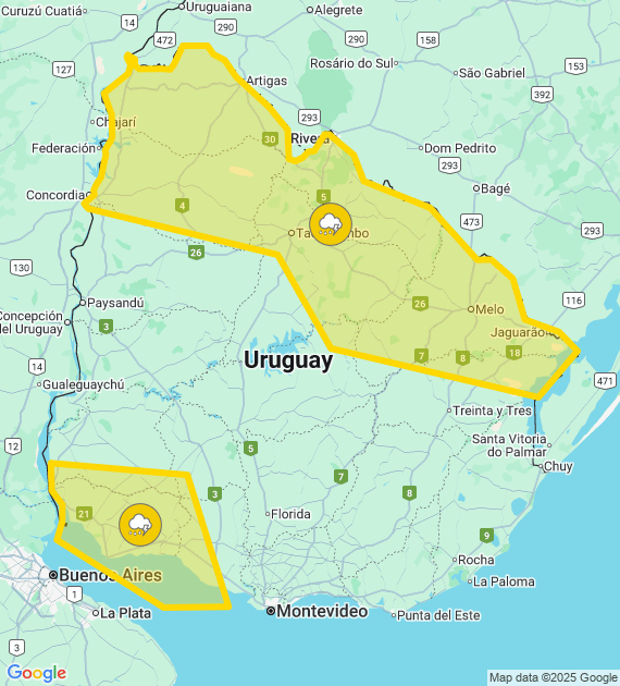 Descripción: Masa de aire húmeda e inestable afecta el país, generando tormentas algunas puntualmente fuertes. Cabe destacar que en zonas de tormentas se podrán registrar intensa actividad eléctrica acompañadas de lluvias abundantes en cortos períodos, ocasional caída de granizo y rachas de vientos fuertes. Se continuará monitoreando la situación y se informará ante eventuales cambios.