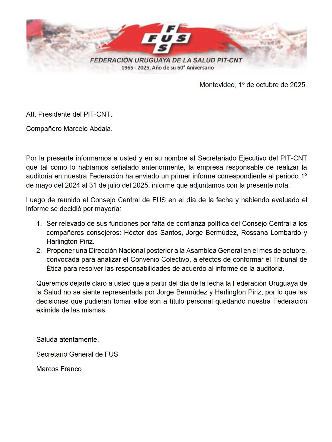 La Federación Uruguaya de la Salud (FUS) acaba de comunicar a la JUNASA y al PIT CNT que Jorge Bermúdez ya no representa al gremio ante esas organizaciones.