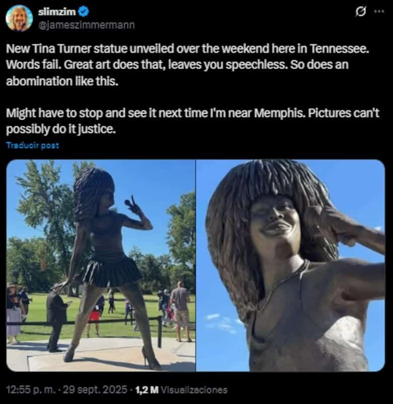 La intérprete de “Proud Mary”, fallecida en Suiza el 24 de mayo de 2023 a los 83 años, fue recreada en bronce con su gran melena, un micrófono en mano, vestido corto y zapatos de tacón, por el escultor Fred Ajanogha. No obstante, la construcción de tres metros de altura recibió más reproches que elogios.Sobran las palabras. El gran arte hace eso, te deja sin palabras. Lo mismo ocurre con una abominación como esta”, expresó un usuario de X mientras que otros agregaron: “No estoy seguro de que la persona que creó esta estatua recién inaugurada de Tina Turner fuera ‘Simplemente la mejor’ persona para el trabajo”; “La estatua de Tina Turner es bastante mala” y “Soy un gran admirador de Tina Turner. Acaban de poner una estatua en su honor en Tennessee. ¡Bien por ellos! Pero, ¿en qué demonios estaban pensando? Esto es horrible“.