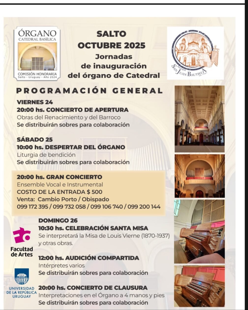 Con inmensa alegría la Comunidad Parroquial y la Comisión Honoraria Órgano Catedral Salto, tenemos el honor de invitarle a la solemne inauguración del Gran Órgano Kuhn instalado recientemente en nuestra Catedral.