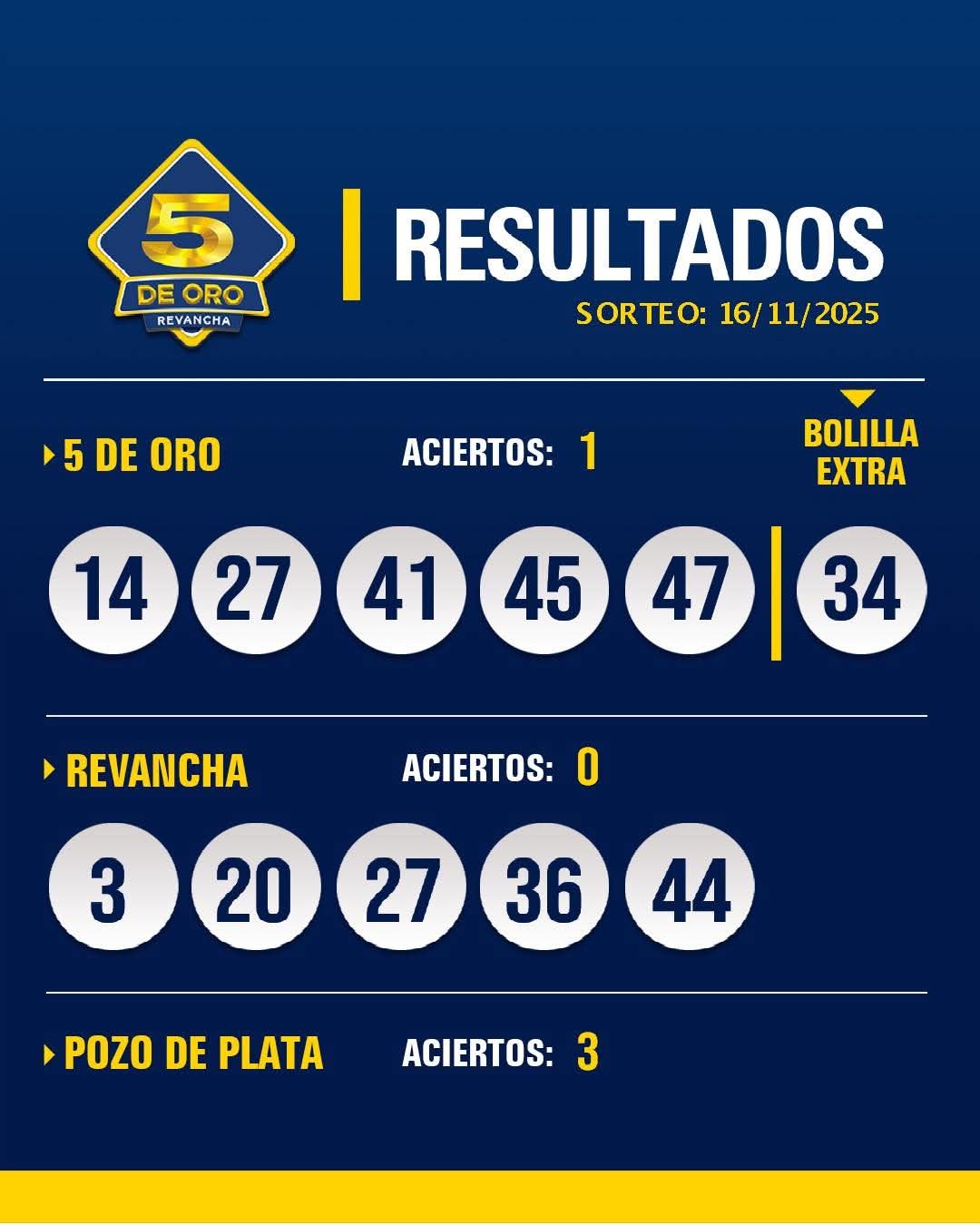 Les compartimos los resultados del sorteo del 5 de Oro con Revancha del día 16 de noviembre de 2025.