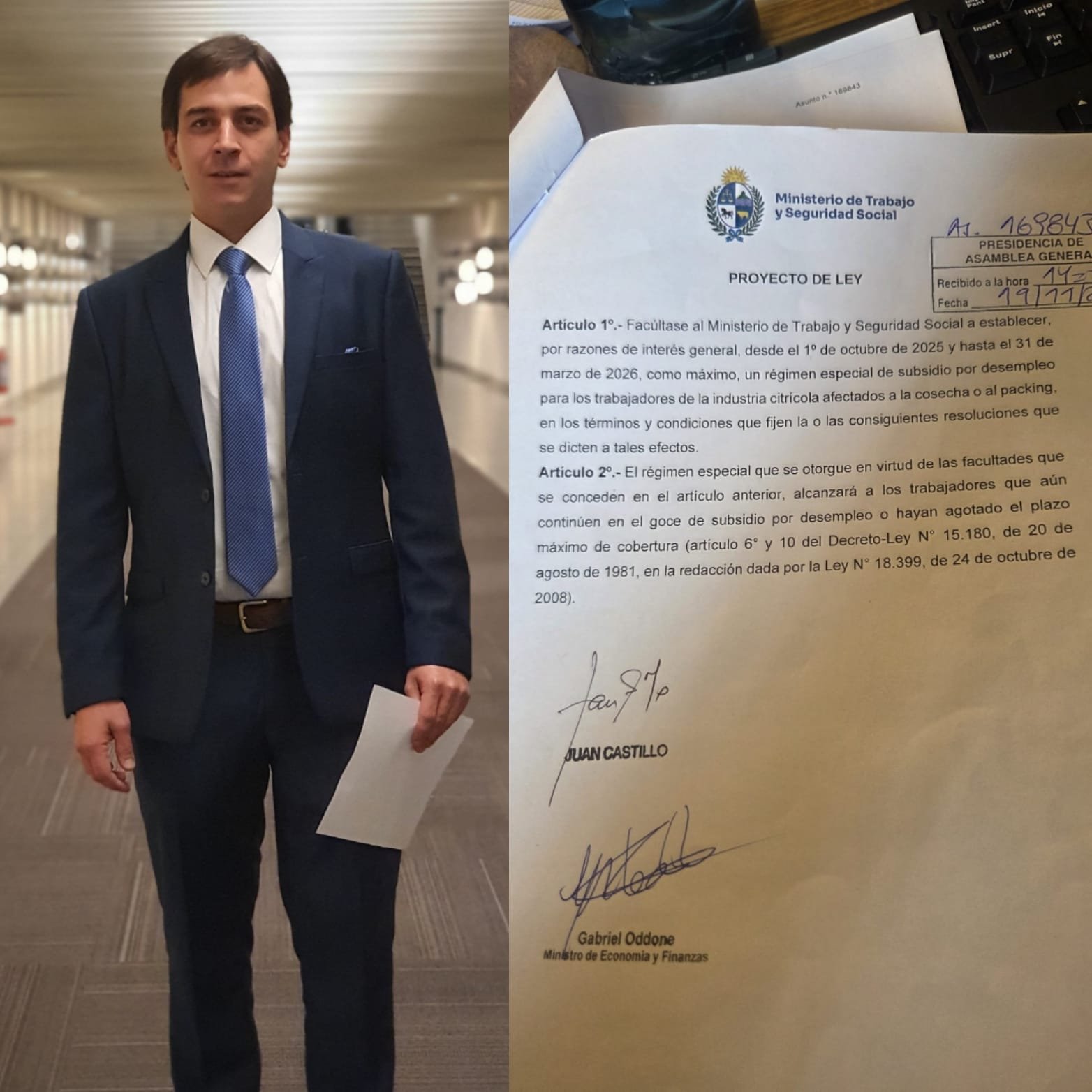 Luego de varias instancias de trabajo, reuniones y gestiones formales como diputado por el litoral norte, hoy finalmente el Poder Ejecutivo enviรณ al Parlamento el proyecto de ley que establece un rรฉgimen especial de subsidio por desempleo para los trabajadores de la citricultura afectados en la zafra, la cosecha y el packing.