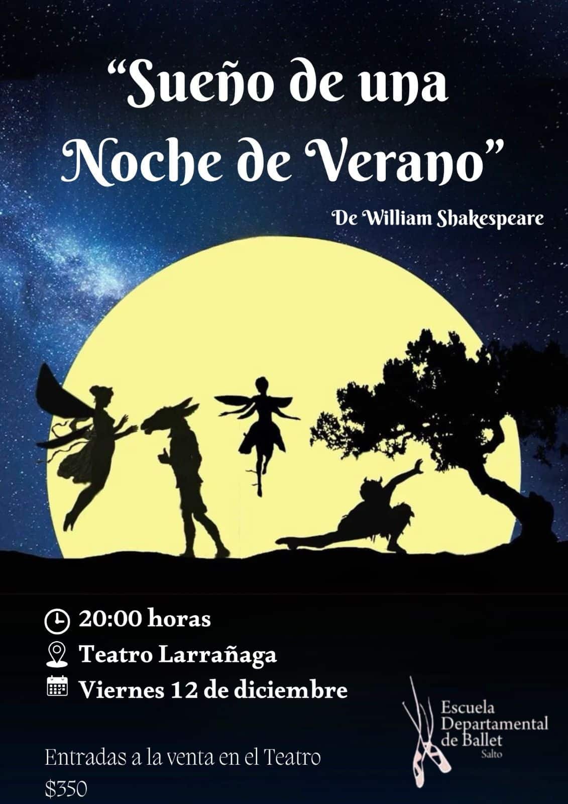 La Escuela Departamental de Ballet de Salto presentará el viernes 12 de diciembre, a las 20:00 horas, la obra “Sueño de una Noche de Verano”, inspirada en el clásico de William Shakespeare. La función tendrá lugar en el Teatro Larrañaga, ofreciendo al público una propuesta artística de primer nivel interpretada por estudiantes y docentes de la institución.