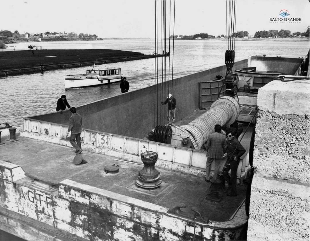 - El 14 de agosto de 1978 se vivió un verdadero clima de acontecimiento en la ciudad de Salto, cientos de personas presenciaron la llegada al puerto de Salto de la barcaza de la flota fluvial Argentina que trasladaba el primer eje de turbina y otros implementos destinados al montaje electromecánico de la central hidroeléctrica.