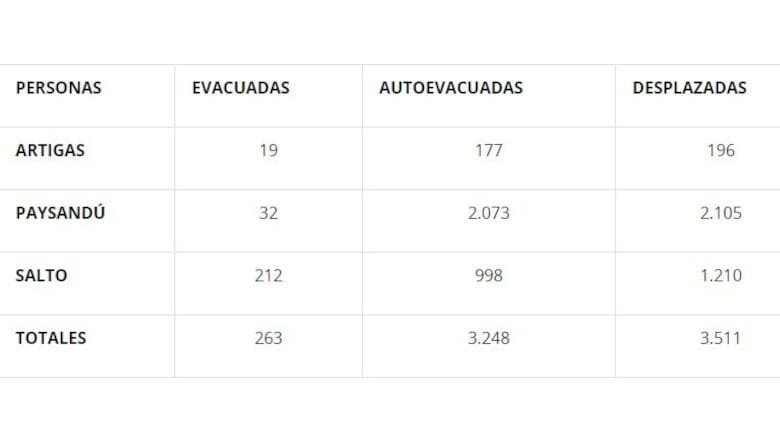 A 45 días de iniciadas las primeras evacuaciones, la situación en el litoral norte del país continúa estable y permanecen 3.511 personas desplazadas: 263 personas evacuadas y 3.248 autoevacuadas. De ese total, 196 se encuentran en Artigas, 1.210 en Salto y 2.105 en Paysandú.