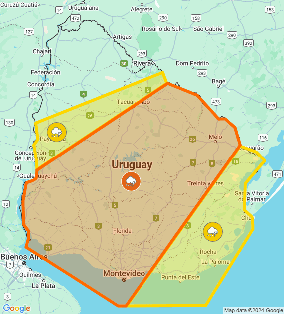 Descripción: Perturbación atmosférica asociada a masa de aire húmeda e inestable afecta el país, generando tormentas algunas puntualmente fuertes. Cabe destacar que en zonas de tormentas se podrán registrar intensa actividad eléctrica acompañadas de lluvias abundantes en cortos períodos, ocasional caída de granizo y rachas de vientos fuertes. Se esperan mejoras temporarias durante la validez de la alerta. Se continuará monitoreando la situación y se informará ante eventuales cambios.