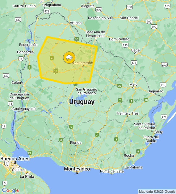 Alerta amarilla por Tormentas fuertes y lluvias intensasSe actualizará a las 14:00 o ante cambios significativosComparte esta nota: Compartir en X (Twitter) Compartir en Facebook Compartir en Email Compartir en WhatsApp Navegación de entradasSe va el 0km de «La Promo» del Centro Comercial de Salto este domingoAsociación Dr. Neri Campos Pierri entregó 20 canastas navideñas a niños y niñas que padecen cáncer