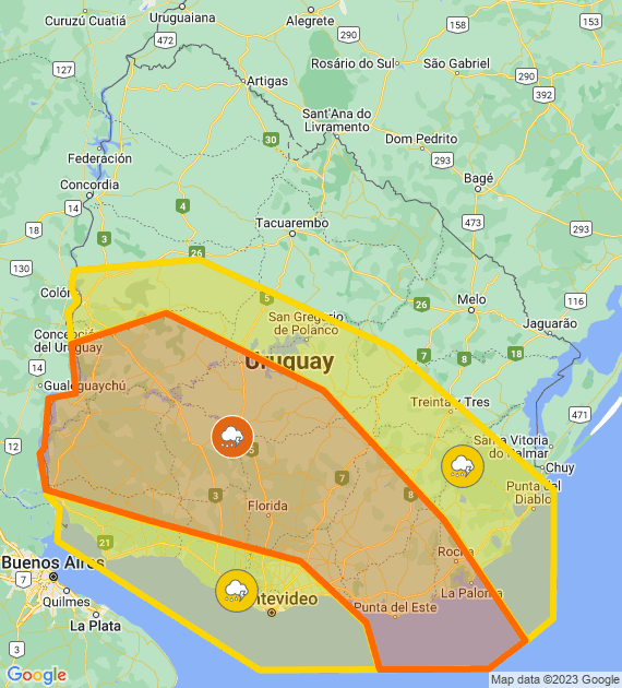 Descripción: Perturbación atmosférica asociada a masa de aire húmeda e inestable afecta el país, generando tormentas algunas puntualmente muy fuertes. Cabe destacar que en zonas de tormentas se podrán registrar lluvias intensas en cortos períodos, ocasional caída de granizo, intensa actividad eléctrica y rachas de viento muy fuertes. Se continuará monitoreando la situación y se informará ante eventuales cambios.