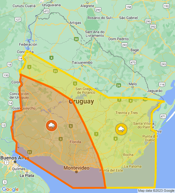 Descripción: Frente semi-estacionario afecta el país, generando tormentas algunas puntualmente muy fuertes. Cabe destacar que en zonas de tormentas se podrán registrar lluvias intensas en cortos períodos, ocasional caída de granizo, intensa actividad eléctrica y rachas de viento muy fuertes. Se continuará monitoreando la situación y se informará ante eventuales cambios.