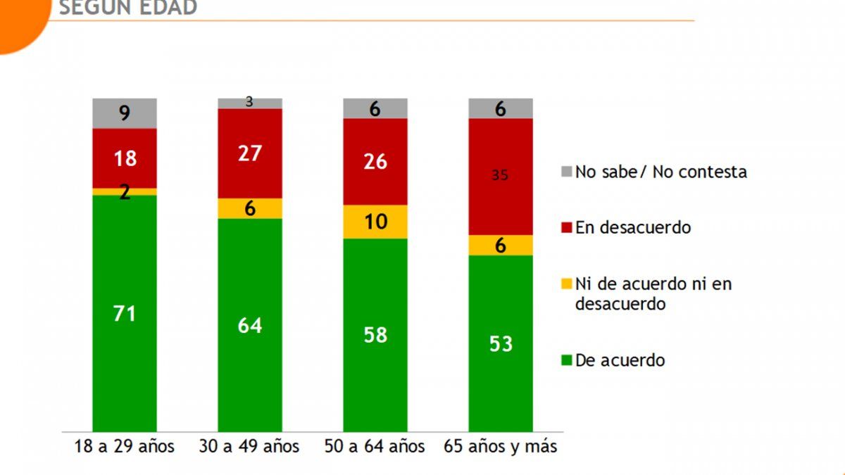 Otro factor que incide en el apoyo a la idea de plebiscitar la norma o no, es la edad: a medida que aumenta la edad, hay menos aprobación a impulsar un plebiscito. Una hipótesis que podría explicar esto es que, entre las personas más mayores, es más fuerte que entre los jóvenes la idea de respetar a rajatabla un pronunciamiento popular ya emitido. Pero, en el balance, incluso entre las personas de mayor edad, el apoyo a la idea de plebiscitar es mayor que el rechazo.