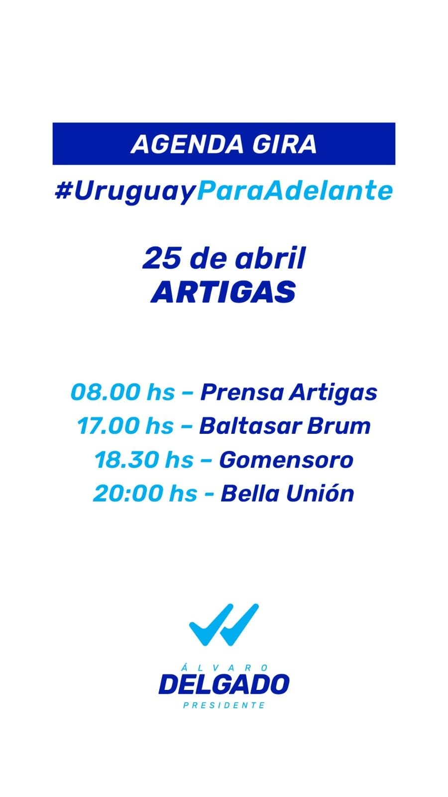 Este jueves comienza la tercera etapa de la campaña para la elección interna, con la 3a vuelta por el país con el pre candidato a la presidencia Álvaro Delgado del Partido Nacional. En esta oportunidad será el turno de los medios a la mañana y a la tarde, las localidades más importantes en cuanto a población. Comienza en Artigas donde se hará medios a la mañana y a la tarde, Baltazar Brum, Bella Unión y Gomensoro