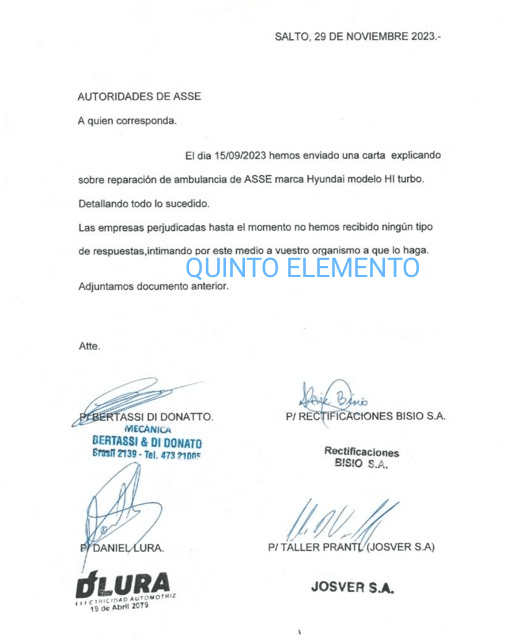 Las empresas salteñas perjudicadas por el accionar del Diputado Rodrigo Albernaz, quien llevó a los talleristas una ambulancia de ASSE para arreglar, se dirigieron a ASSE una vez más en espera de respuesta , a lo ya denunciado con anterioridad. Los empresarios exigen respuesta del organismo , que no habría dado el consentimiento oficial para que la ambulancia fuera retirada del organismo hacia Salto , pero así sucedió y fue arreglada por diversos talleristas ,a pedido del Diputado de Cabildo Abierto Rodrigo Albernaz. La ambulancia,cuyo motor rectificado está en una de las empresas ,a quien se les debe fue traída a Salto por Albernaz, quien pensaba usarla en su provecho «político». El arreglo se hizo y no lo pagó. Por lo que se nos informó desde ASSE, a días de conocerse la situación,es que se comenzaba una investigación administrativa, a la fecha no se conoce resultado y tampoco si hay denuncia judicial hacia el Diputado Albernaz por apropiación de bien público e incluso hurto , porque en definitiva,es lo que habría sucedido . Alguien la sustrajo del garage de ASSE, alguien la trajo a Salto y alguien la mandó a arreglar.
