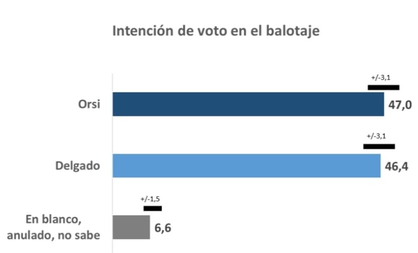 A tres días del balotaje, y con los actos de cierre de campañas ya realizados, quedan solo “los días de veda”, que igualmente en tiempos de internet siguen usándose para terminar de convencer a los electores que aún no están decididos. Los datos que se muestran a continuación provienen de encuestas realizadas entre el 14 y el 20 de noviembre (ayer). El 47% dice que votaría a Orsi y el 46,4% a Delgado. El 6,6% piensa votar en blanco, anular su voto o no sabe qué hará.