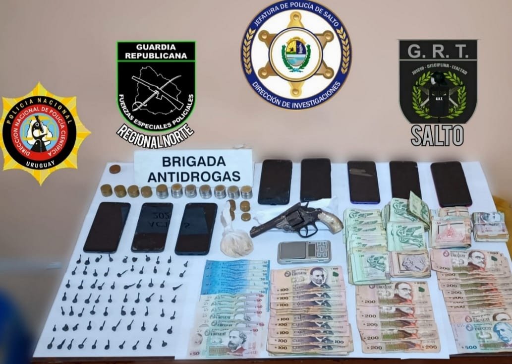 $U 14.043 (Catorce mil cuarenta y tres pesos Uruguayos), un Revolver sin marca calibre 32, una balanza de precisión y ocho celulares. Culminando con cinco detenidos que se encontraban en el lugar. Las personas detenidas serán conducidos a Fiscalía en horas de la tarde del día de hoy