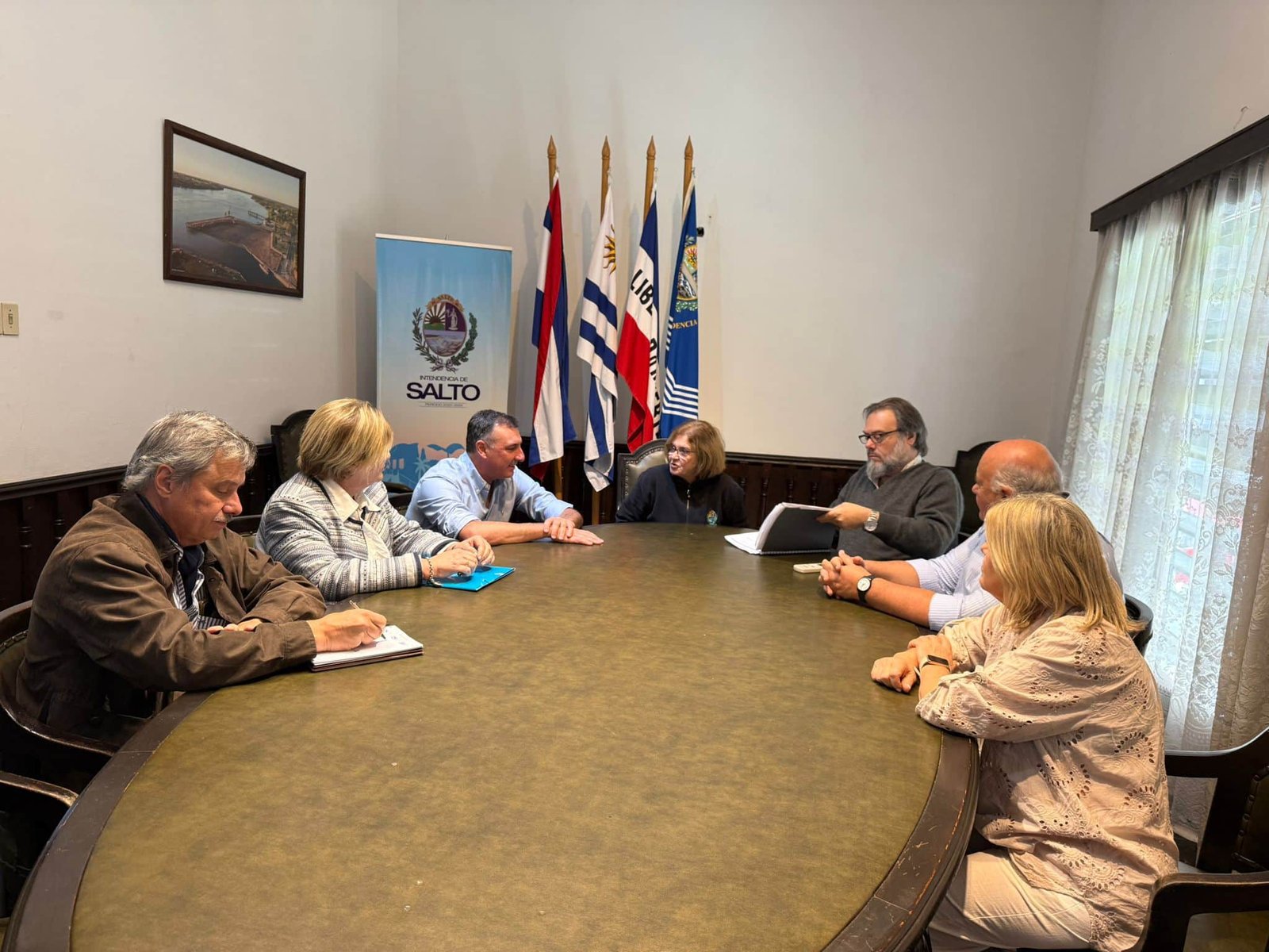 El encuentro tuvo lugar en el despacho de la Intendenta Ingrid Urroz, quien estuvo acompañada por el Dr. Juan Pablo Cesio. En representación del nuevo gobierno participaron el Cr. Walter Texeira Núñez, la Lic. Lucía Minutti, el Sr. Francisco Blardoni y la Esc. Myrna Haller.