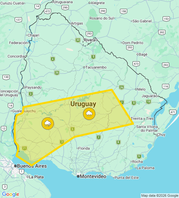 Advertencia amarilla por Persistencia de tormentas puntualmente fuertes y lluvias abundantes