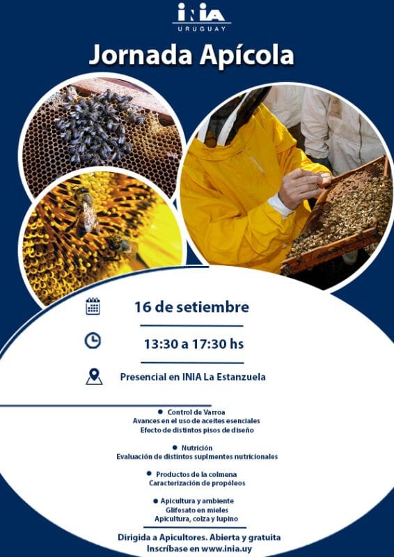 | Este sábado 16 desde las 13:30 y hasta las 17:30 horas les invitamos a apicultores a acompañarnos en una actividad dirigida a comentar avances en temas sanitarios, caracterización de propóleos y otros temas ambientales relativos al mejor aprovechamiento de cultivos como Lupino y Colza. Cuenta con el apoyo y participación de técnicos de Fac. de Ciencias-UDELAR, Fac. Veterinaria -UDELAR, del Instituto de Investigaciones Biológicas Clemente Estable, Polo Tecnológico de Pando y CIENUR Paysandú. Es una actividad abierta, gratuita con INSCRIPCION PREVIA en el vínculo de esta comunicación. La actividad es presencial y se grabará para dejarla disponible en la semana siguiente en el Canal YouTube de INIA. |