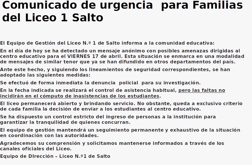 Situación alarmante en el departamento de Salto ante amenazas en dos liceos. Las situaciones se dieron a conocer en la tarde de hoy, 16 y 16:50 hrs.ciando las autoridades de los liceos 1 y 5 denunciaron ante policía las situaciones
