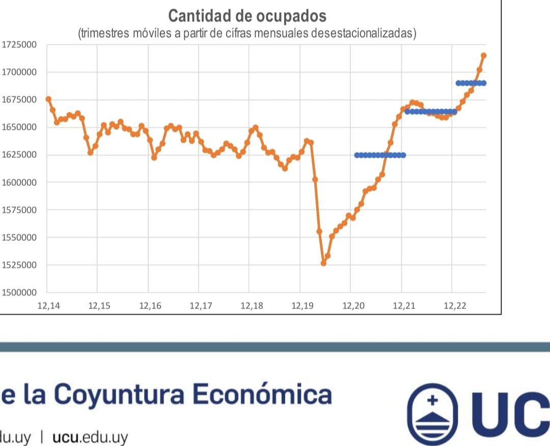 En la gráfica que se incluye al pie de esta página se presenta la evolución de la cantidad de personas ocupadas desde el final de 2014. La línea continua, en
