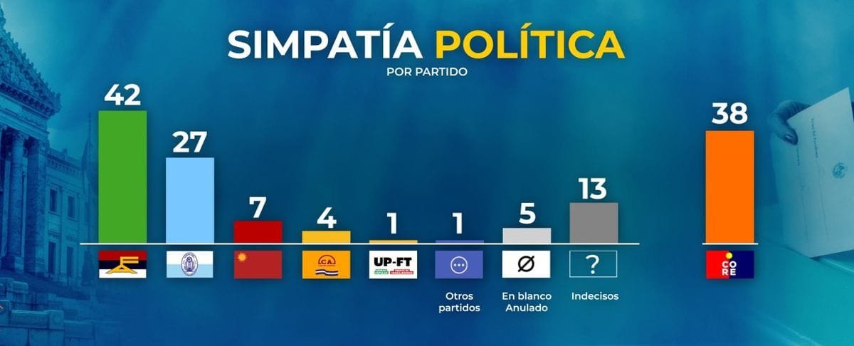 Durante la segunda quincena de febrero la encuesta regular de Equipos Consultores preguntó a los uruguayos de forma abierta (es decir, sin guiar opciones) “a qué partido votaría si las elecciones fueran hoy”. Ante esta pregunta, 42% respondió que lo haría por el Frente Amplio, 27% se inclinó al Partido Nacional, 7% al Partido Colorado, 4% mencionó a Cabildo Abierto, 1% a la Unidad Popular-Frente de Trabajadores, y 1% menciona otros partidos (ninguno de los cuales alcanza al 1% individualmente). Por otra parte, 5% dijo que votaría en blanco o anulado, y 13% está indeciso . Los resultados comparados con la medición anterior muestran una caída de 3 puntos del Frente Amplio, cuyos registros han mostrado ciertas oscilaciones en el último semestre (aunque se han mantenido por encima el 40% de las preferencias). También se aprecia una pérdida de 2 puntos del Partido Nacional, que ha oscilado en una franja algo por debajo del 30% en el último año). El Partido Colorado permanece incambiado con 7%, y Cabildo Abierto crece 2 puntos.La mirada en términos de bloque muestra que la diferencia entre ambos es de 4 puntos (42% el Frente Amplio contra 38% de la Coalición Multicolor).