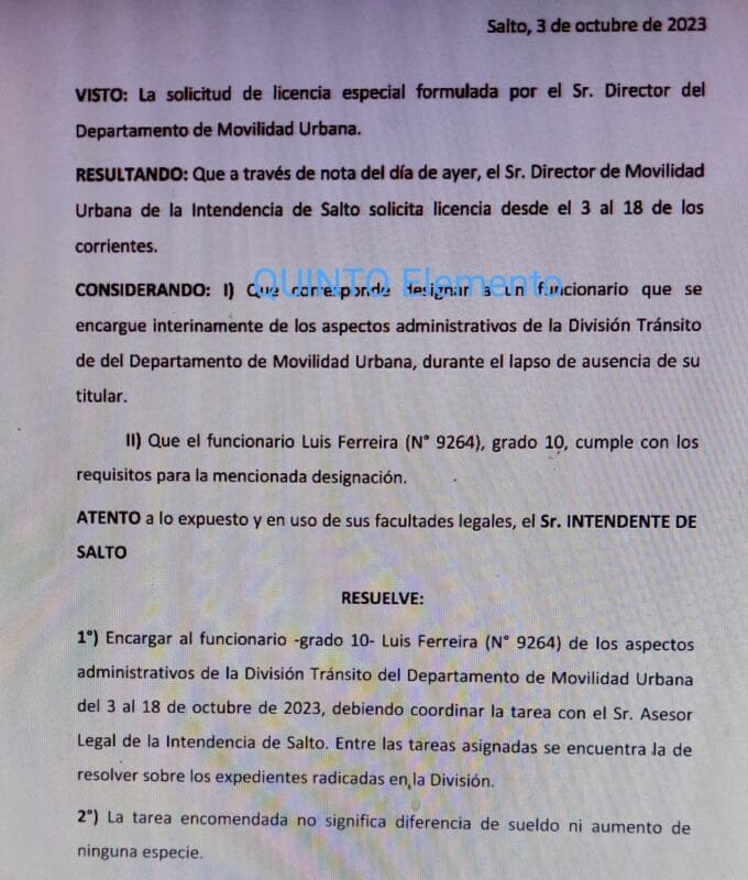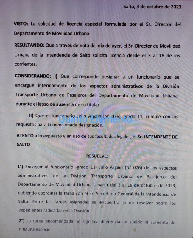 En Tránsito el funcionario Luis Ferreira grado 10 , hasta hoy director administrativo de tránsito será encargado en Tránsito de intendencia de Salto y en ómnibus,un funcionario de toda la vida ahí ,Julio Argain .