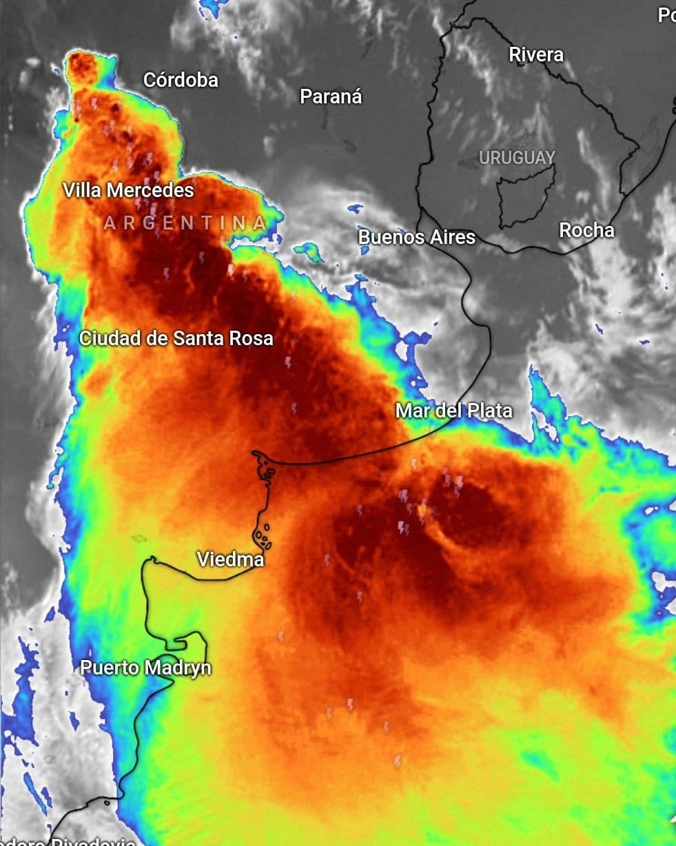Imagen de satélite de la hora 22.44 muestra el impresionante mesosistema Convectivo sobre Argentina. Las tormentas han dejado granizo de más de 10 centímetros, rachas de viento de 150 km/h. Lamentablemente en Bahía Blanca fallecieron 13 personas por el tiempo real.