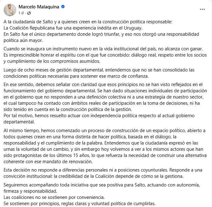 Márquez defendió el origen y la importancia de este instrumento político, recordando que fue impulsado por figuras como Julio María Sanguinetti con el objetivo de unir fuerzas entre distintos partidos y garantizar gobernabilidad. En esa línea, remarcó que la coalición ha demostrado ser efectiva en elecciones y en la gestión, sin embargo, fue crítica con algunos movimientos recientes dentro del sector, particularmente los vinculados al dirigente Marcelo Malaquina, a quien cuestionó por tomar decisiones sin la debida consulta interna. Según sostuvo, este tipo de acciones responden más a intereses personales que a una construcción política colectiva, y podrían terminar favoreciendo indirectamente a la oposición.