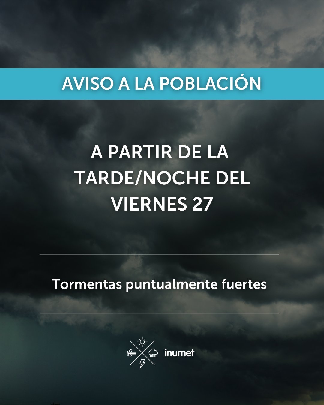 Inumet emitió un aviso por tormentas fuertes que ingresarán por el suroeste y avanzarán hacia el este. Se esperan lluvias abundantes, rachas de viento, granizo y actividad eléctrica, con acumulados de 40-60 mm en 12 horas al sur de Río Negro.