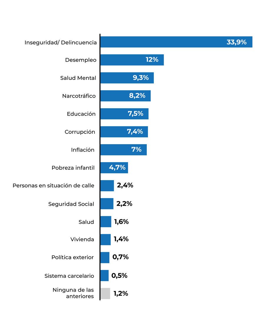 Por su parte, para el 8,2% de los encuestados el narcotráfico es el principal motivo de preocupación, mientras que la educación el 7,5%. La corrupción con 7,4% y la inflación con 7%.