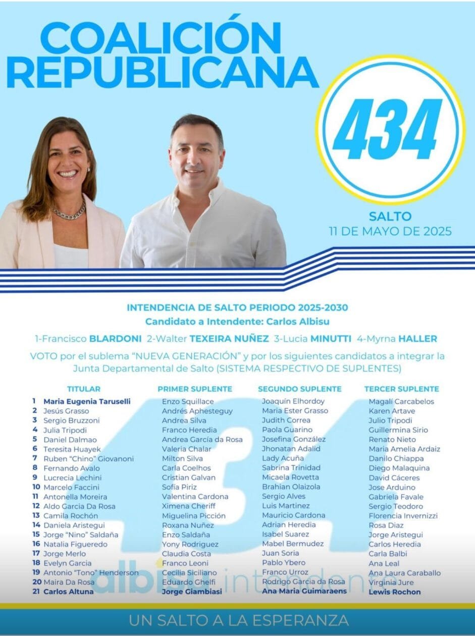 Con enorme orgullo y emoción queremos compartir un logro que nos llena de energía para seguir adelante: la Lista 434 fue una de las primeras en estar en la cartelera de la Corte Electoral. Este es un paso clave en nuestro compromiso con una política diferente, más cercana, transparente y enfocada en las verdaderas necesidades de la gente.