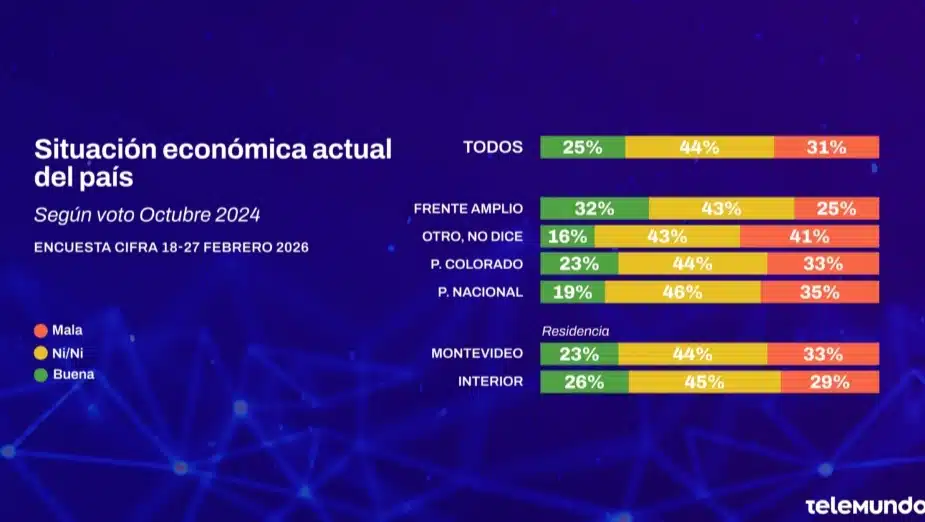 ¿Cómo ven hoy los uruguayos la situación económica? Uno de cada cuatro uruguayos afirma que la situación económica del país es buena y casi un tercio cree que es mala. Pero hay un grupo grande de uruguayos que cree que hoy la economía tiene una nota media y no está en un buen momento pero tampoco en uno malo. Hoy los habitantes del interior son un poco más positivos que los de Montevideo.
