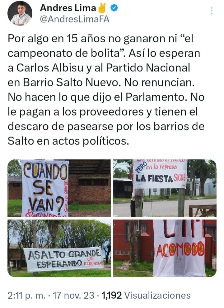 Nada sorprende del intendente Lima, nada . Ni en su gestión,ni en su vida política, ni en sus relaciones humanas. Para quienes lo conocemos , su historia errática de desencuentros,de promesas incumplidas, de traiciones y de speach fáciles y de momento pero que no ejecuta. El Lima que tiene problemas graves en su interna , que va creando quioscos para repartir sus caramelos,para que sus dirigentes no hagan escándalos, el que tiene directores investigados por la Justicia, que tiene una intendencia fundida y no levanta. El mismo que a pesar de sus viajes semanales ,no figura en encuestas nacionales ,este mismo Lima ,el que mintió una y otra vez , como con la clínica de prevención del suicidio. Un desastre natural, que opera en el desespero de un hermano que no mide , bueno en realidad,mide un 29% y eso preocupa y mucho.En ese desespero, salió hoy a colgar carteles , que obviamente pintaron en locales de Lima , ,en realidad gente de su entorno, de listas de Salto Nuevo, pintaron carteles , violentos,agresivos y realmente desleal , sin respetar al contrincante que tendrá en esta carrera de cara a las departamentales. Lima creyó que su «manija» ,asociada al periodismo de los profe y contenidos, lograrían bajar a un Albisu que pisa fuerte , que tiene una historia de familia que habla de su ética y de su historia. Se equivocó, Albisu hoy volvió,lo complicó al intendente, lo puso nervioso, lo alteró y lo demuestra una vez más ,en esta violencia desatada ,cuando como intendente tendría que dar el ejemplo, por lo de la buena convivencia, el trato del buen vecino y el respeto con el que compite. Pero es Lima , nada sorprende.